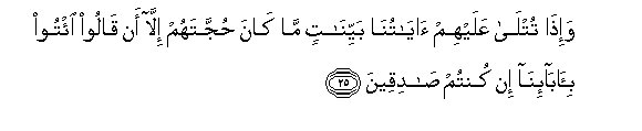 25. Na wakisomewa Aya zetu zilizo wazi hawana hoja ila kusema: Waleteni