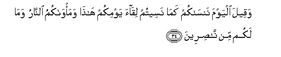 wa siku yenu hii; na mahali penu ni Motoni, wala hamna wa kukunusuruni.