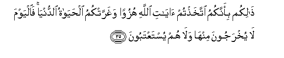 35. Hayo ni kwa sababu nyinyi mlizifanyia mzaha Aya za Mwenyezi Mungu;