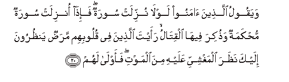 20. Na Waumini wanasema: Kwa nini haiteremshwi Sura? Na inapo teremshwa