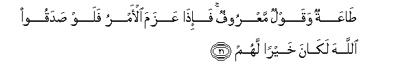 21. Ut'iifu na kauli njema. Na jambo likisha azimiwa, basi wakiwa