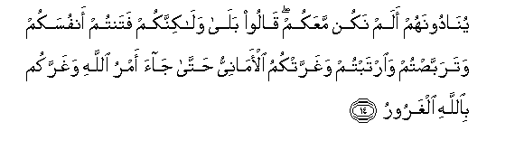14. Watawaita wawaambie: Kwani vile hatukuwa pamoja nanyi? Watawaambia: