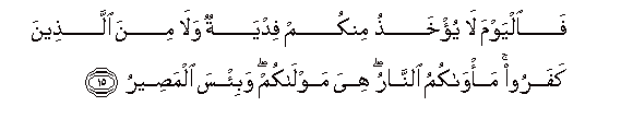 15. Basi leo haitapokelewa kwenu fidia, wala kwa wale walio kufuru.