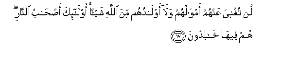 17. Hayatawafaa kitu mali yao wala watoto wao mbele ya Mwenyezi Mungu.