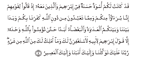 4. Hakika nyinyi mna mfano mzuri kwenu kwa Ibrahim na wale walio