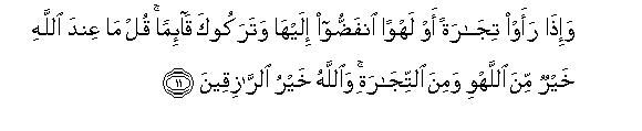 umesimama. Sema: Yaliyoko kwa Mwenyezi Mungu ni bora kuliko pumbao na biashara.