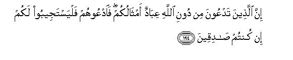 194. Hakika hao mnao waomba asiye kuwa Mwenyezi Mungu ni waja mfano