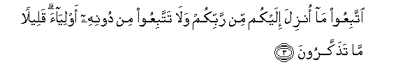 3. Fuateni mliyo teremshiwa kutoka kwa Mola Mlezi wenu, wala msifuate