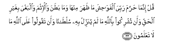 na ya siri, na dhambi, na uasi bila ya haki, na kumshirikisha Mwenyezi