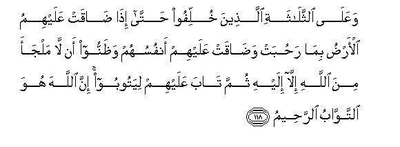118. Na pia wale watatu walio achwa nyuma hata dunia wakaiona dhiki